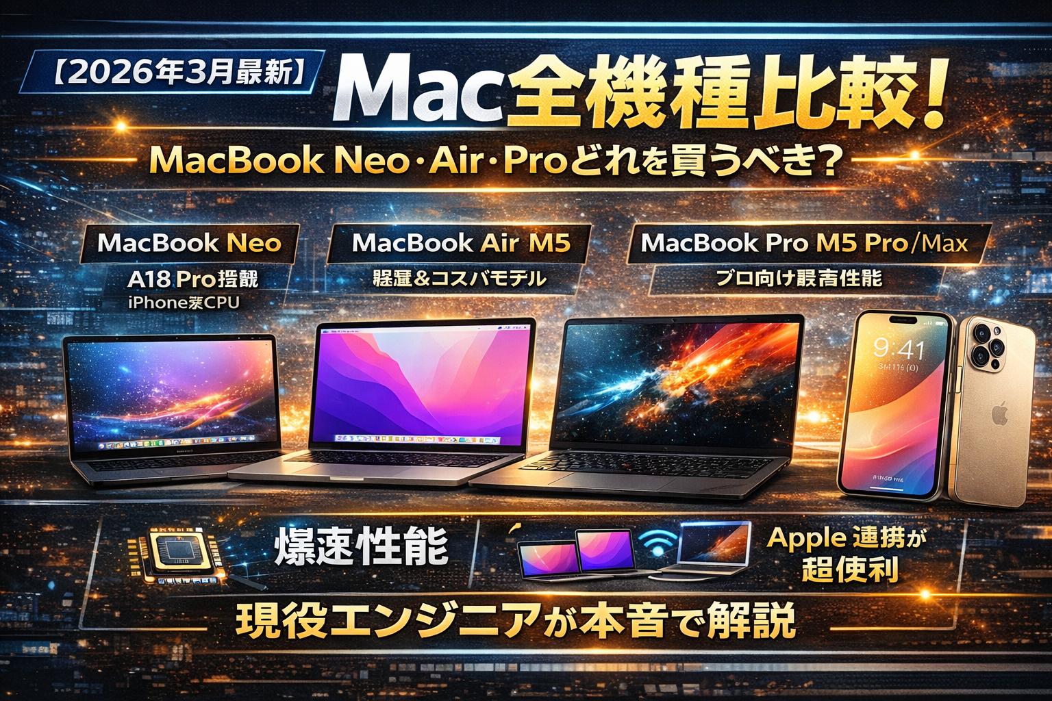 開発ツール2026年3月8日【2026年3月最新】Mac全機種比較!MacBook Neo・Air・Proどれを買うべき?現役エンジニアが本音で解説2026年3月発表のMacBook Neo・MacBook Air M5・MacBook Pro M5 Pro/Maxを現役フロントエンドエンジニアが徹底比較。iPhone 17eとの連携メリットも含め、用途別のおすすめMacを本音で紹介します。#Mac#MacBook#Apple